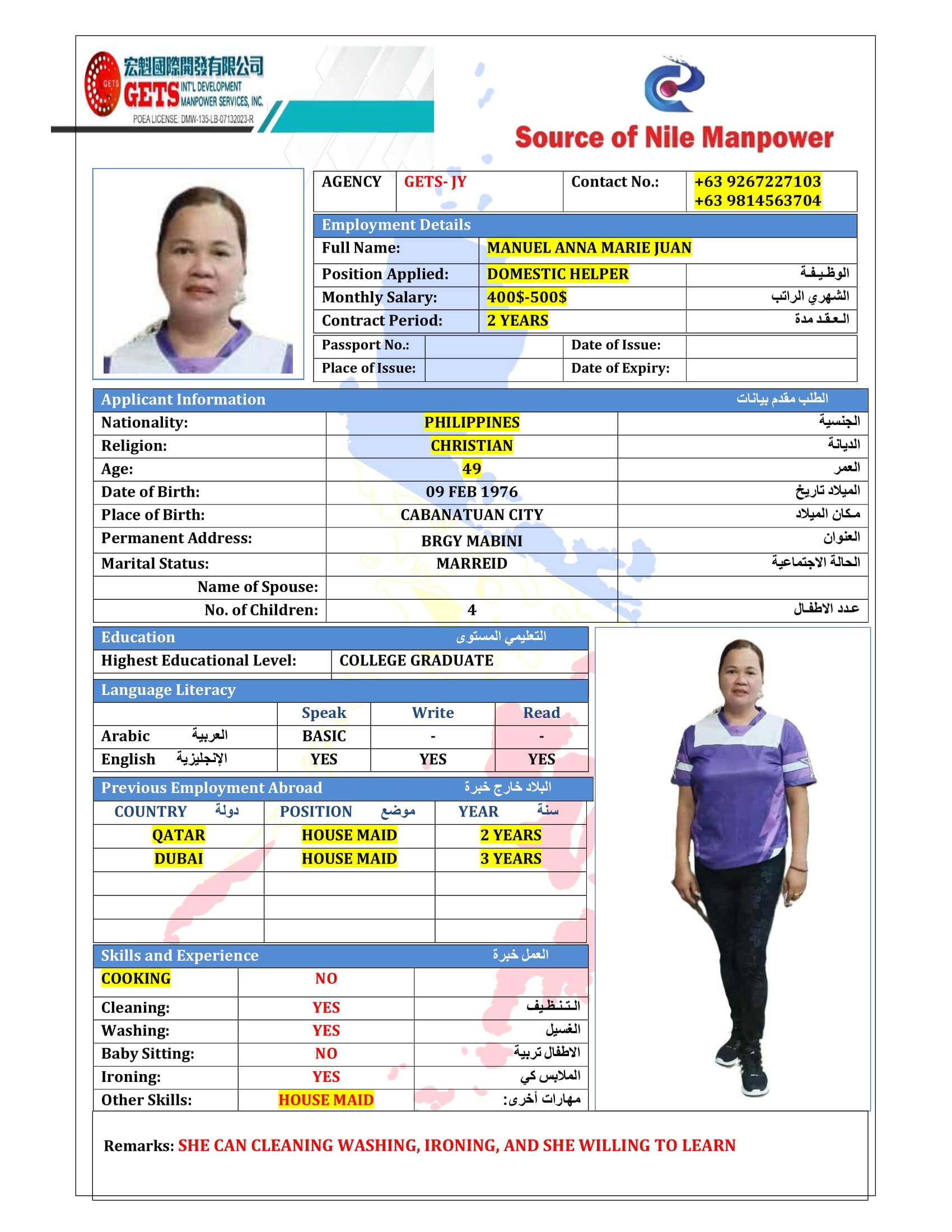 الاسم | MANUEL, ANNA MARIE JUAN |