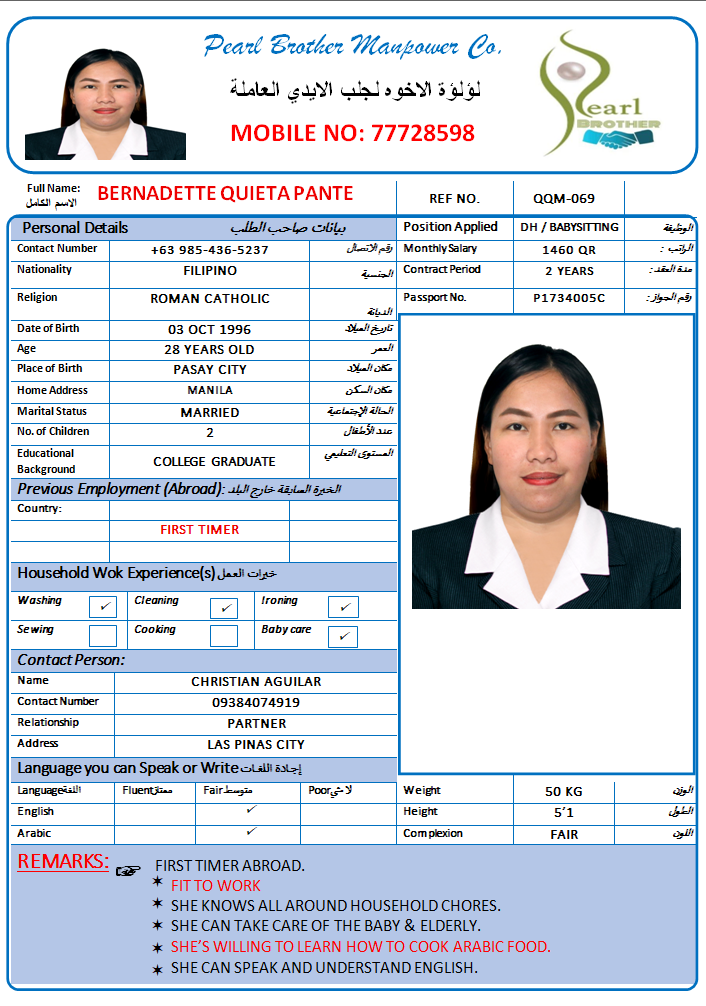 الاسم - عربي BERNADETTE QUIETA PANTE