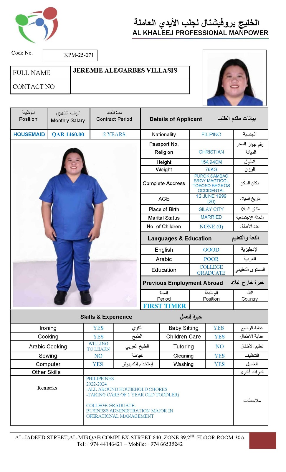 الاسم - عربي JEREME ALEGARBES VILLASIS