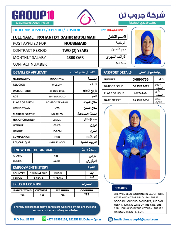 الاسم - عربي ROHANI BT SAHIR MUSLIMAH
