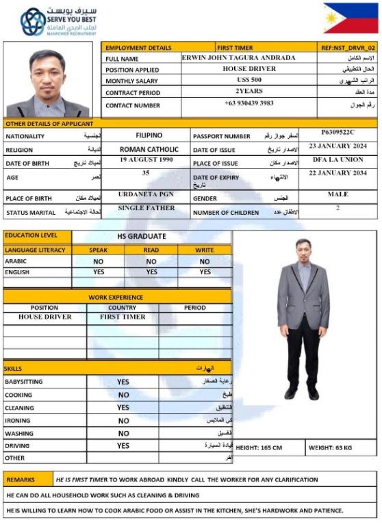 الاسم - عربي ERWIN JOHN TAGURA ANDRADA