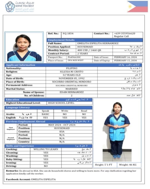 الاسم - عربي EMELITA ESPELITA HERNANDEZ