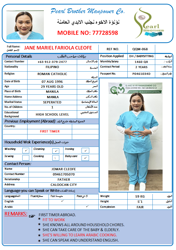 الاسم - عربي JANE MARIEL FARIOLA CLEOFE