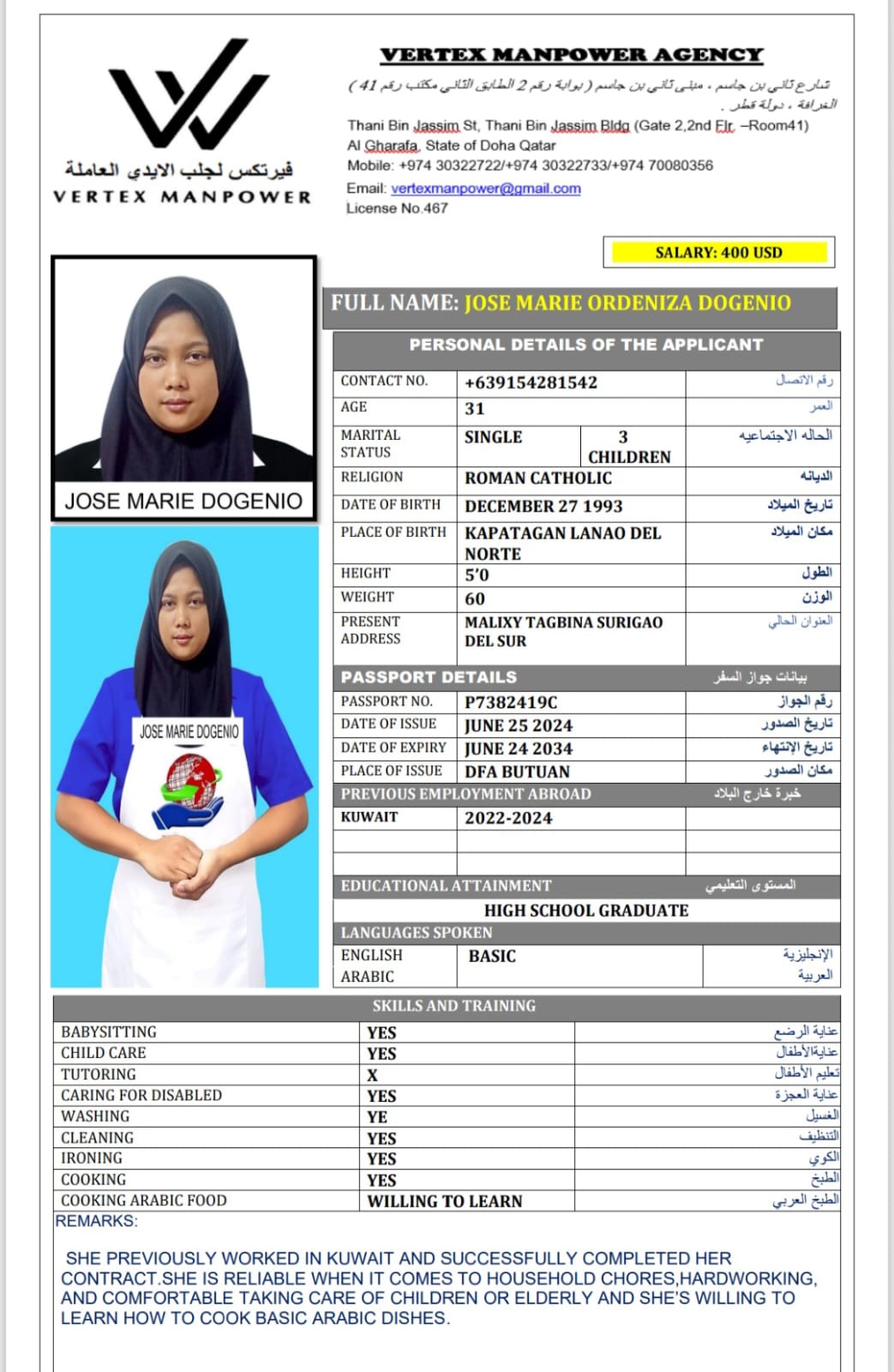 الاسم - عربي JOSE MARIE ORDENIZA DOGENIO