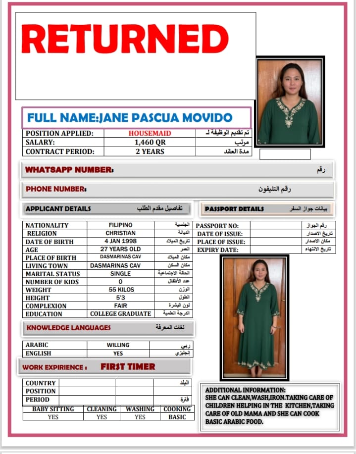 الاسم - عربي JANE MOVIDO /RETURN HOUSEMAID