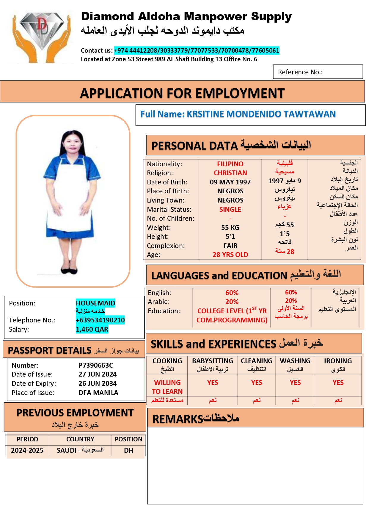 الاسم - عربي KRISTINE MONDENIDO TAWTAWAN