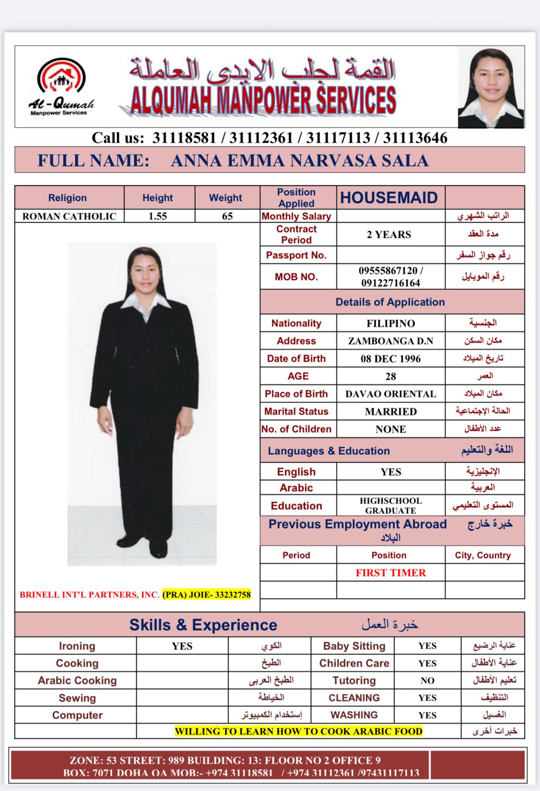 الاسم - عربي ANNA EMMA NARVASA SALA