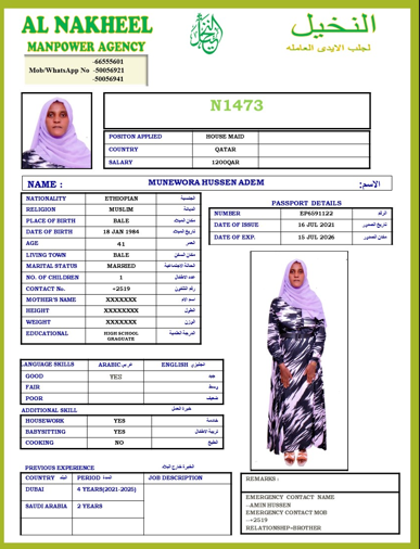 الاسم - عربي MUNEWORA HUSSEN ADEM