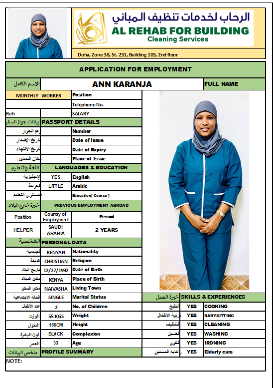 يمكنها القيام بكل الأعمال المنزلية، تعرف كيفية طهي الأطعمة العربية الأساسية، ورعاية الأطفال وكبار السن، الغسيل والكي.