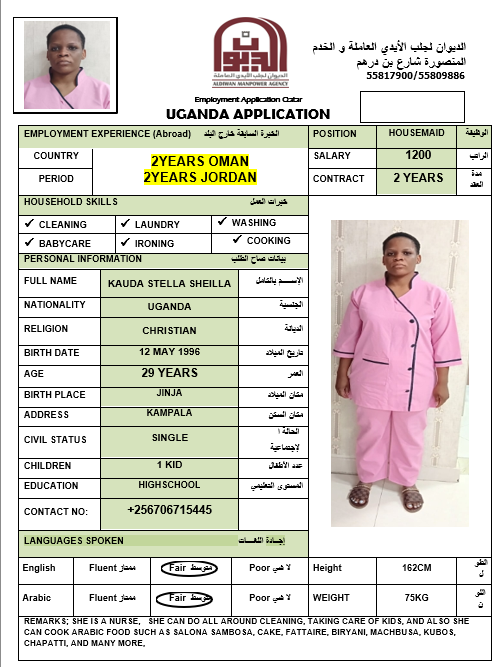SHE IS A NURSE. SHE CAN ALSO TAKE CARE OF KIDS, SHE CAN-DO ALL-AROUND CLEANING, SHE CAN COOK SOME ARABIS FOOD SUCH AS SALONA, SAMBOSA, KABSA, BIRYANI, CAKE FATTAIRE, MAJBUS, KUBOS, CHAPATTI AND MANY MORE.