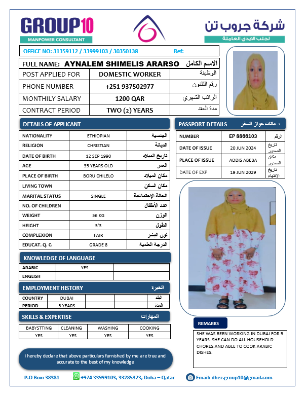 الاسم - عربي AYNALEM SHIMELIS ARARSO