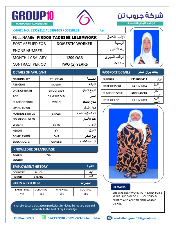 الاسم - عربي FIRDOS TADESSE LELEMWORK