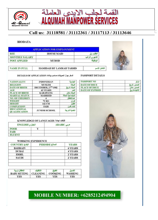 الاسم - عربي HAMIDAH BT LAMRAH TARSID
