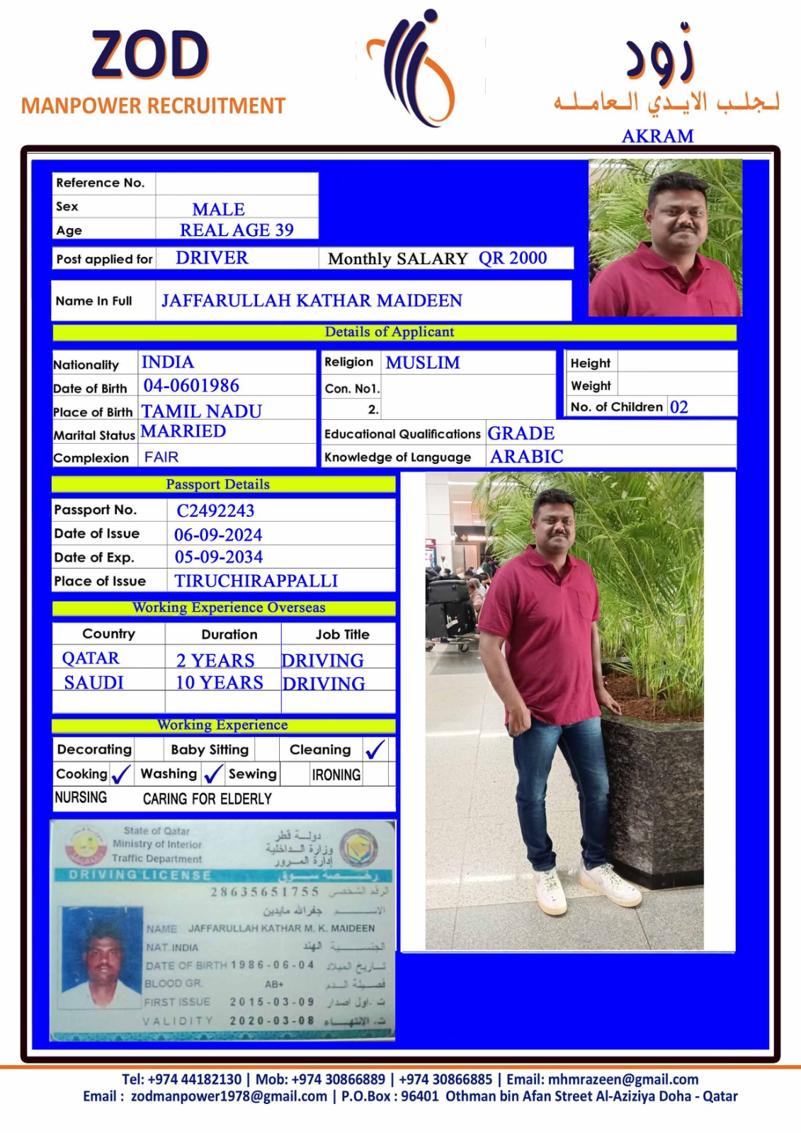 الاسم - عربي JAFFARULLAH KATHAR MAIDEEN