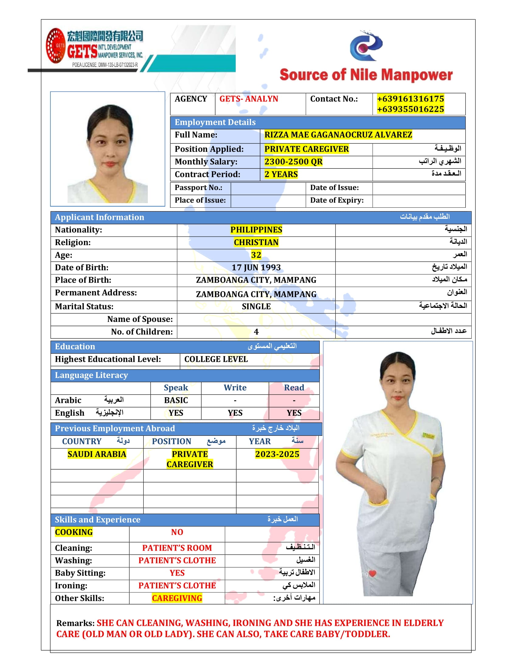 SHE IS PROFESSIONAL CAREGIVER WITH EXPERIENCE IN SAUDI ARABIA. SHE JUST FINISHED HER CONTRACT IN SAUDI ARABIA.