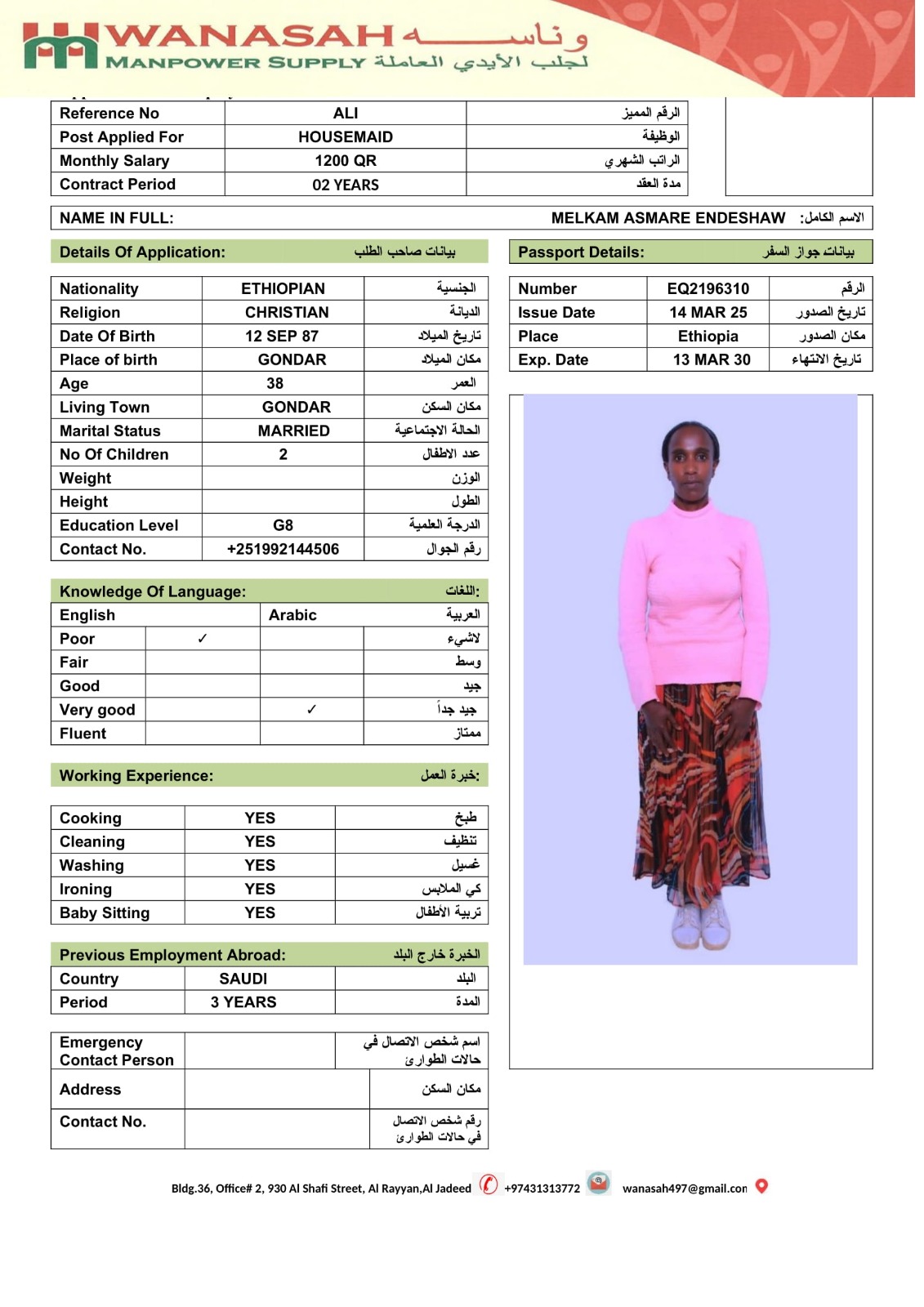 الاسم - عربي MELKAM ASMARE