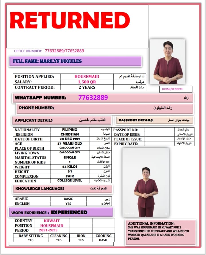الاسم - عربي MARILYN DUQUILES/PHIL RETURN