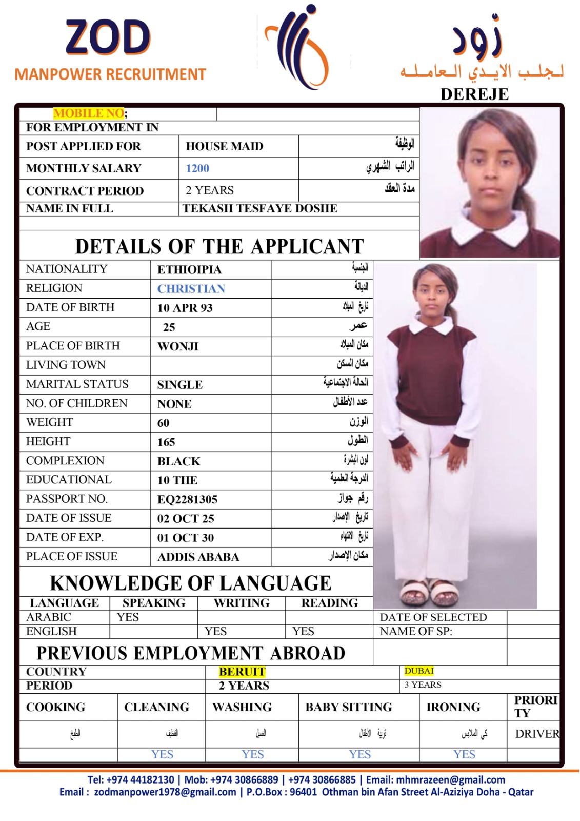 الاسم - عربي TEKASH TESFAYE DOSHE