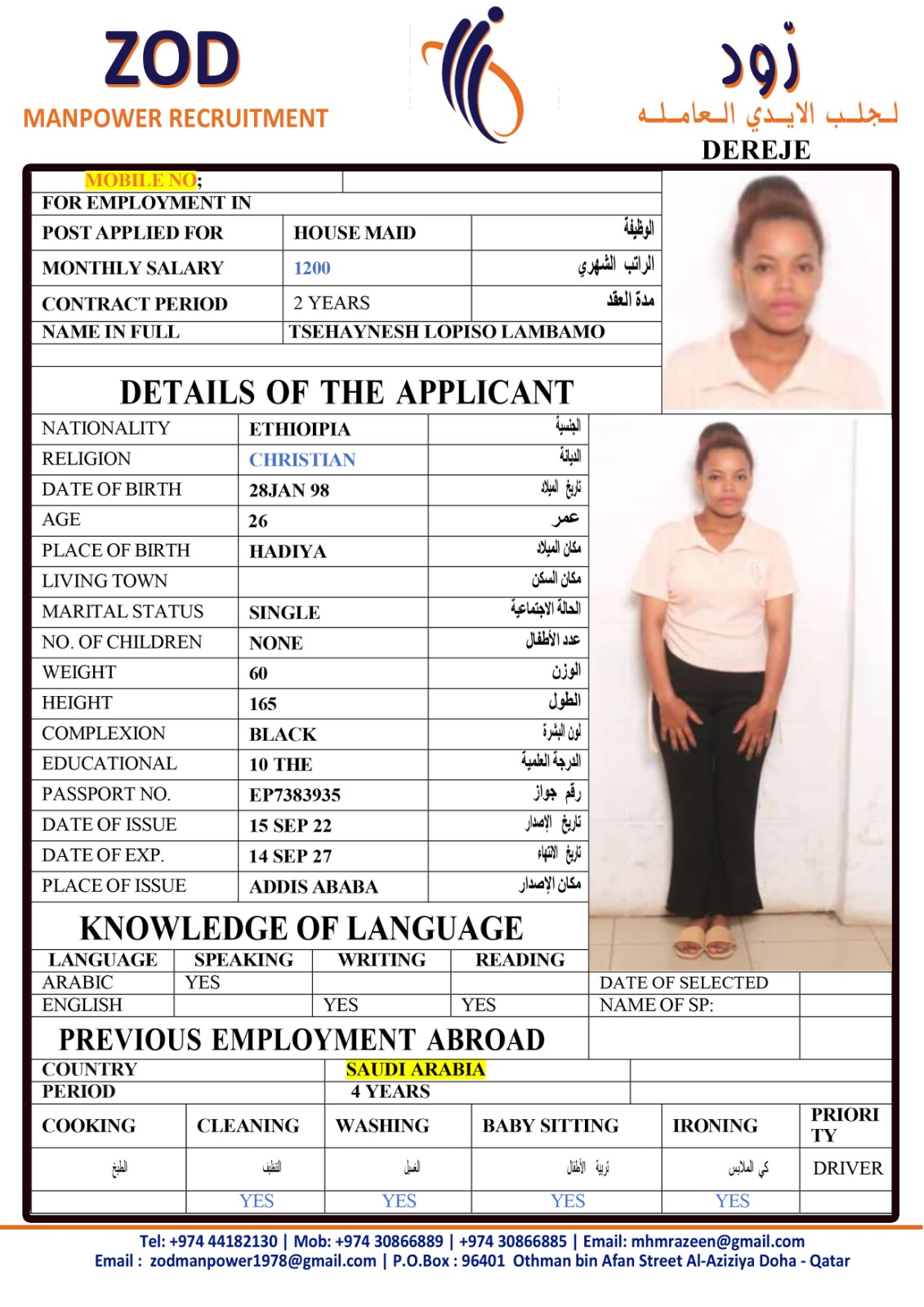 الاسم - عربي TSEHAYNESH LOPISO LAMBAMO