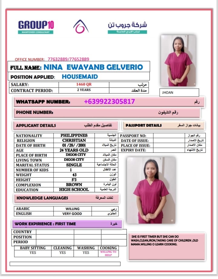 الاسم - عربي NINA EWAYAN GELVERIO/PHIL HOUISEMAID