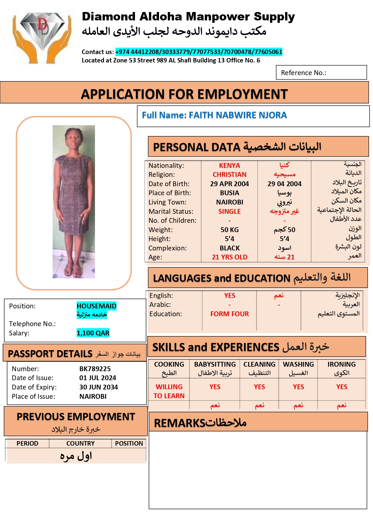 الاسم - عربي FAITH NABWIRE NJORA
