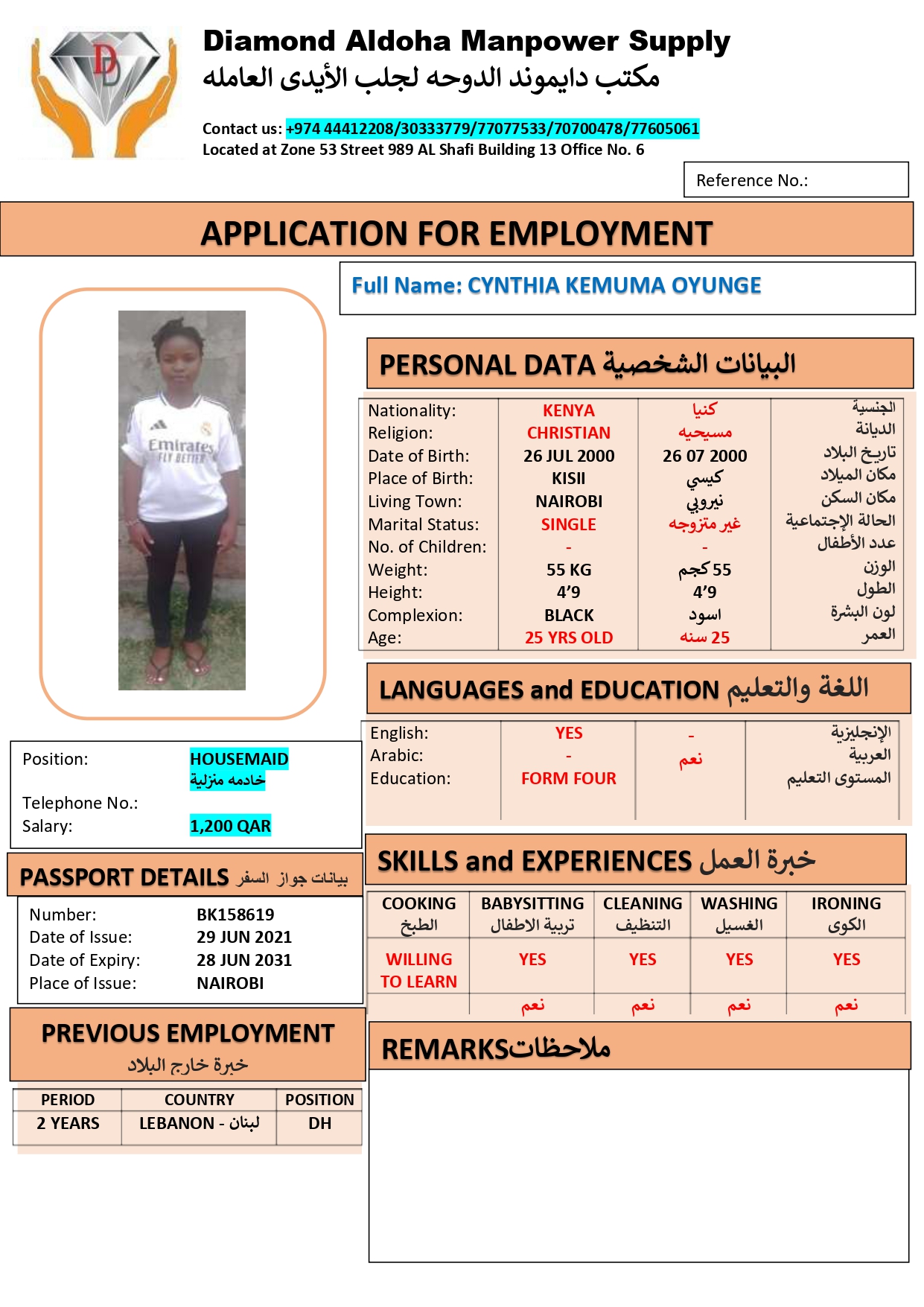 الاسم - عربي CYNTHIA KEMUMA OYUNGE
