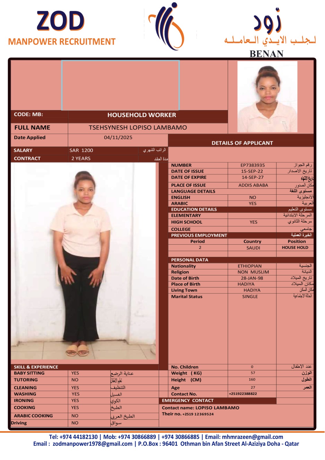 الاسم - عربي TSEHSYNESH LOPISO LAMBAMO