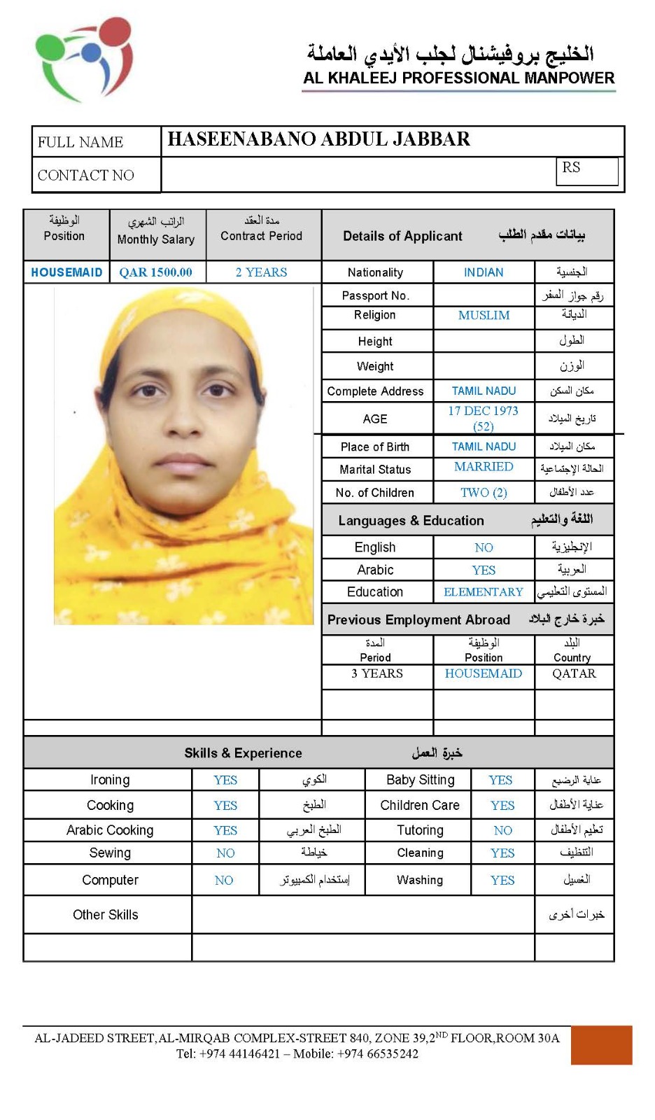 الاسم - عربي HASEENABANO ABDUL JABBAR