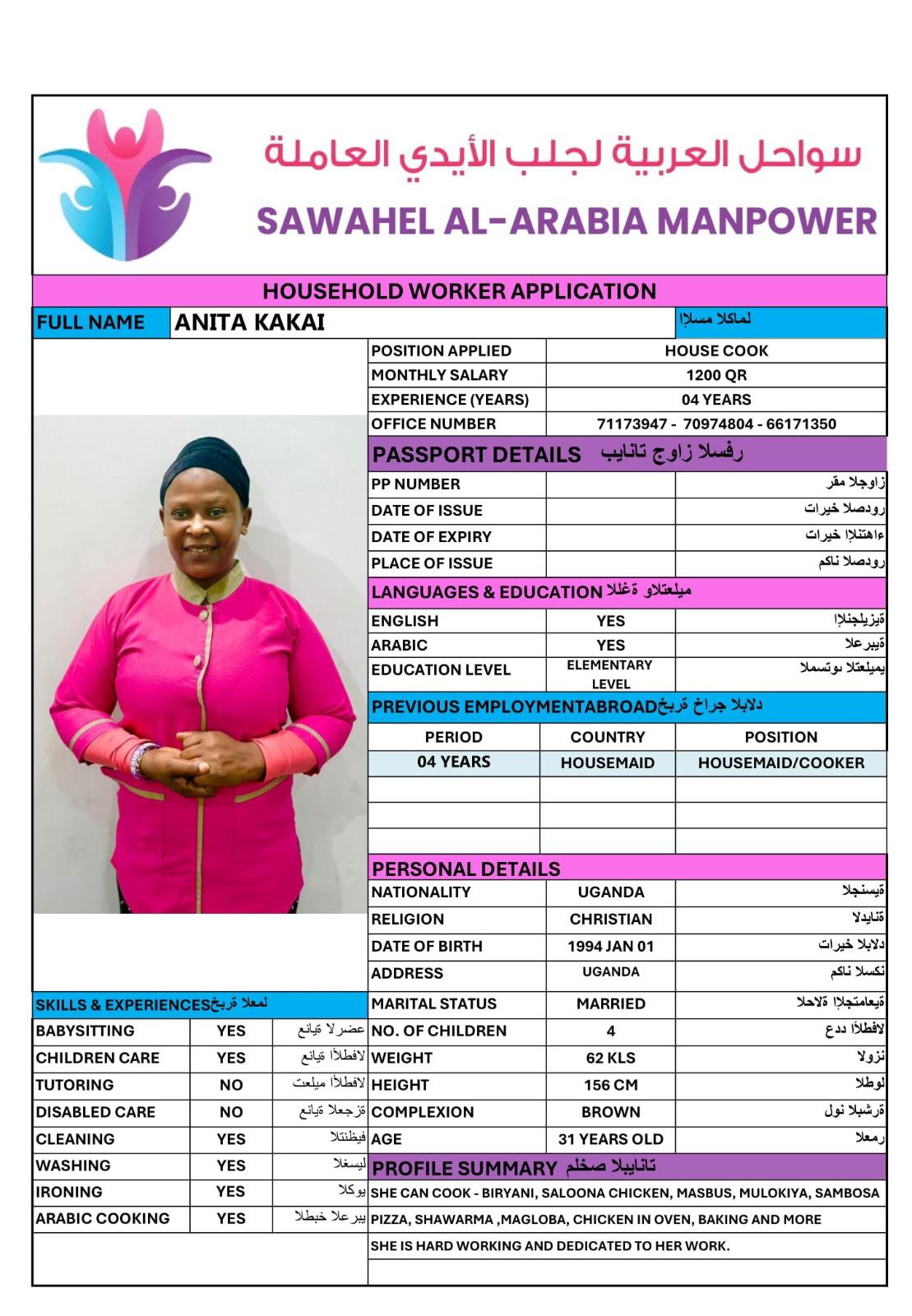 CAKE, SALONA, BIRYANI, KABSA, MULUKIYA , MASBUS, AND SHE KNOW ALSO TO DO GAWA AND CHAI AND SHE IS WILLING TO KNOW MORE MENU COOKING,SHE IS VERY HARD WORKING, AND SHE DOESNT WANT TO GO ON HER COUNTRY SHE WANT TO STAY AND DO HER WORK TO SAVE MONEY FOR HER CHILDREN.