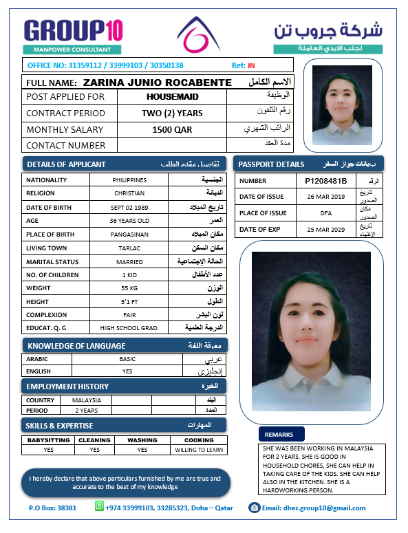 الاسم - عربي ZARINA JUNIO ROCABENTE