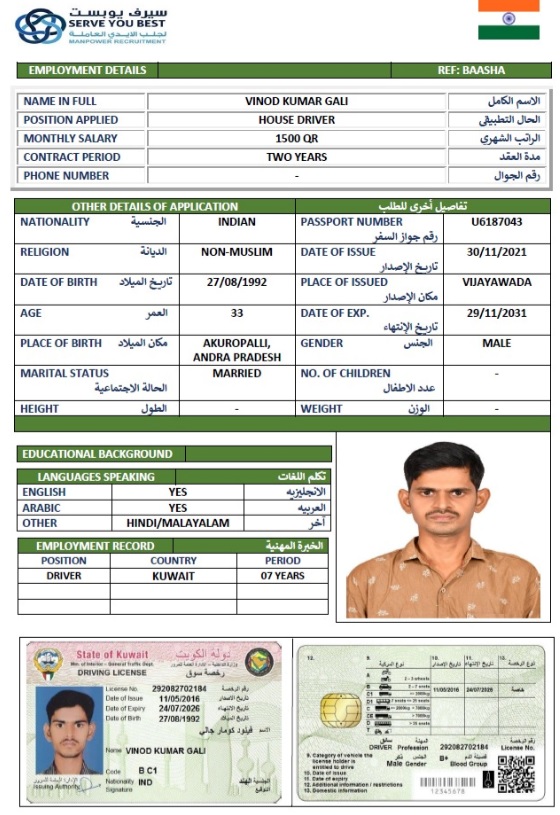 الاسم - عربي VINOD KUMAR GALI