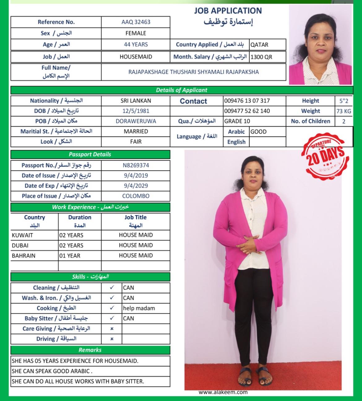 الاسم - عربي RAJAPAKSHAGE THUSHARI SHYAMALI RAJAPAKSHA