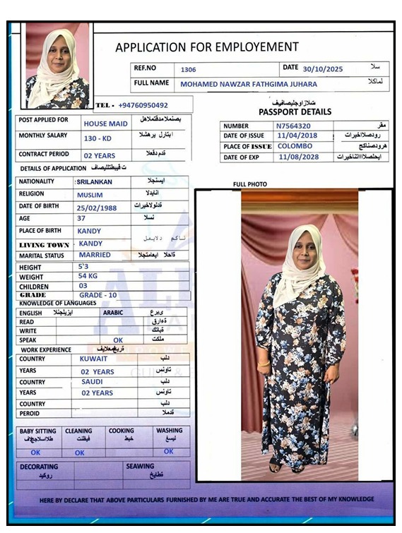 الاسم - عربي MOHAMED NAWZAR FATHGIMA JUHARA