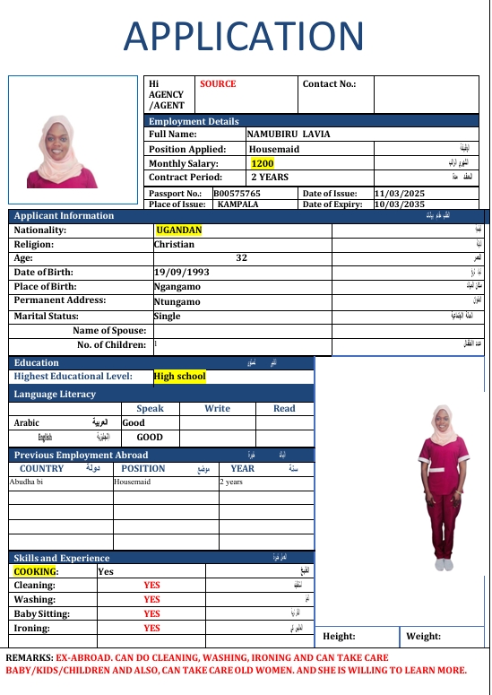EX-ABROAD,CAN DO CLEANING , WASHING , IRONING AND CAN TAKE CARE BABY/ KIDS /CHILDREN AND ALSO CAN TAKE CARE OLD WOMEN , AND SHE IS WILLING TO LEARN MORE.