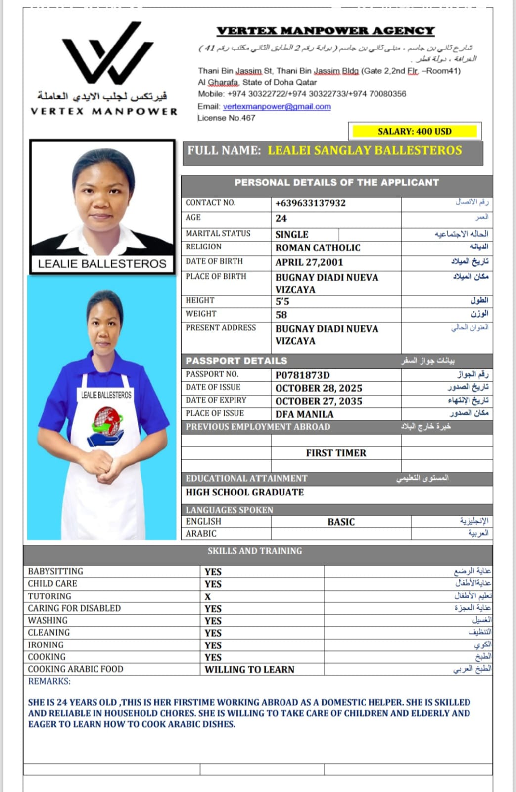 تجيد العناية بالاطفال و كبار السن و التنظيف و الغسيل و الكوي و الطبخ و لديها الرغبة في تعلم الطبخ العربي