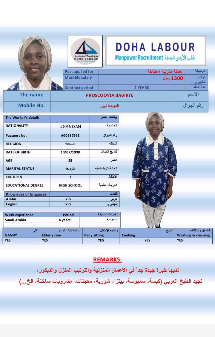 الاسم - عربي PROSCOOVIA BABIRYE ( غير متاحه مؤقتا. تم اختيارها من قبل عميل آخر وفي وانتظار تأكيد الحجز)