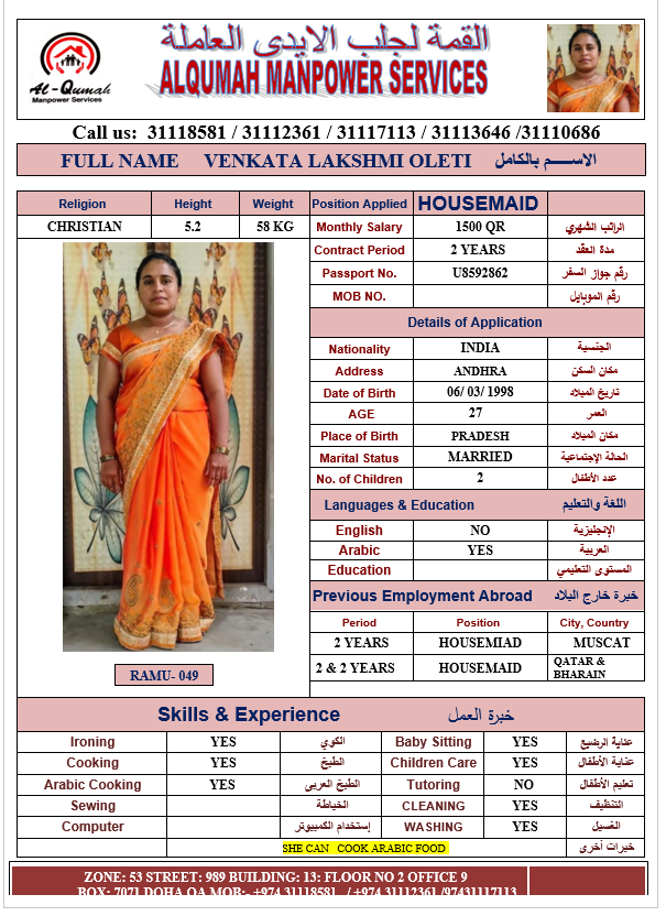 الاسم - عربي VENKATA LAKSHMI OLETI