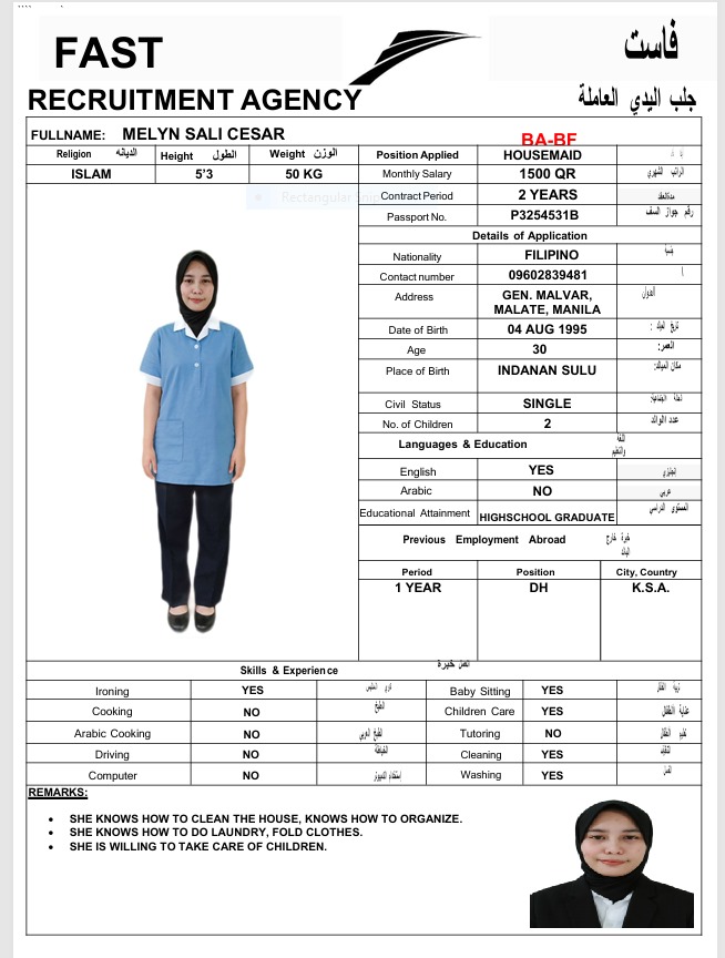 | *هي تعرف كيف تنظف المنزل، وتعرف كيف تنظم. *هي تعرف كيف تغسل الملابس وتطويها. *هي مستعدة للعناية بالأطفال. | |