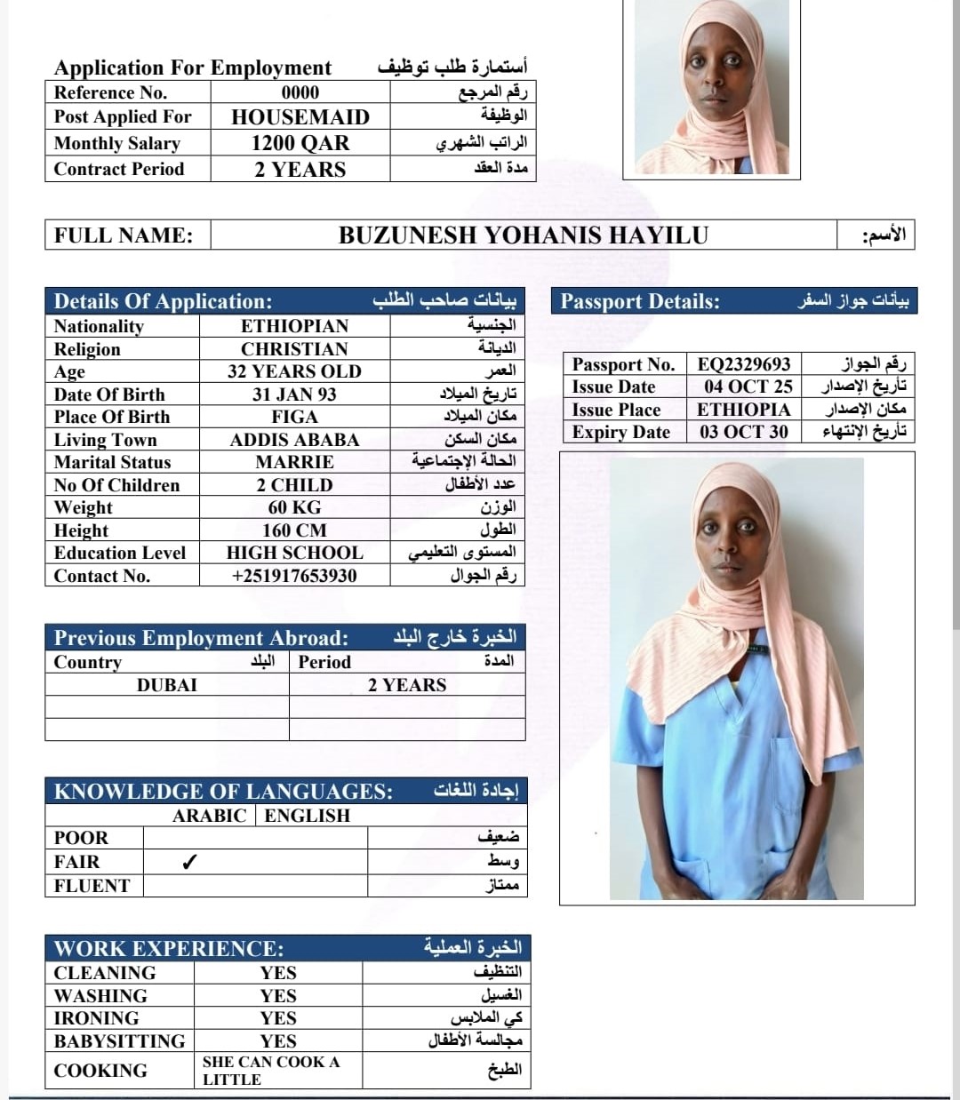 الاسم - عربي BEZUNESH YOHANES HAYILU