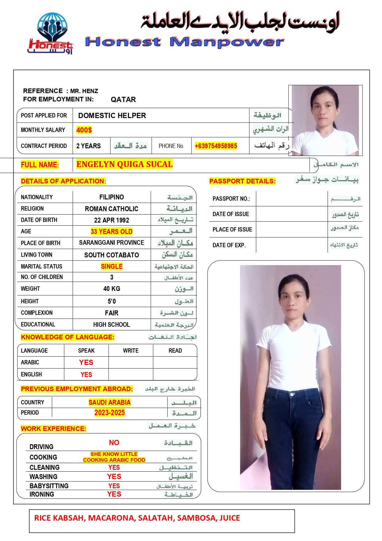 الاسم - عربي ENGELYN QUIGA SUCAL