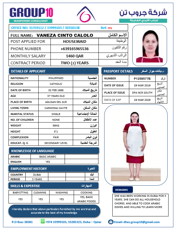 الاسم - عربي VANEZA CINTO CALOLO