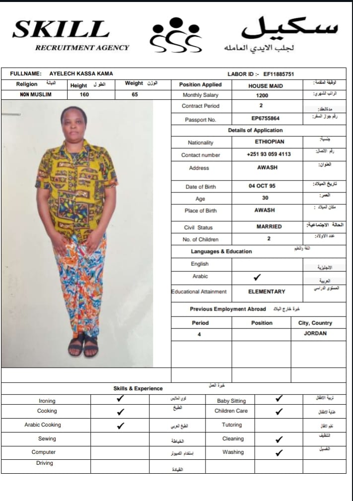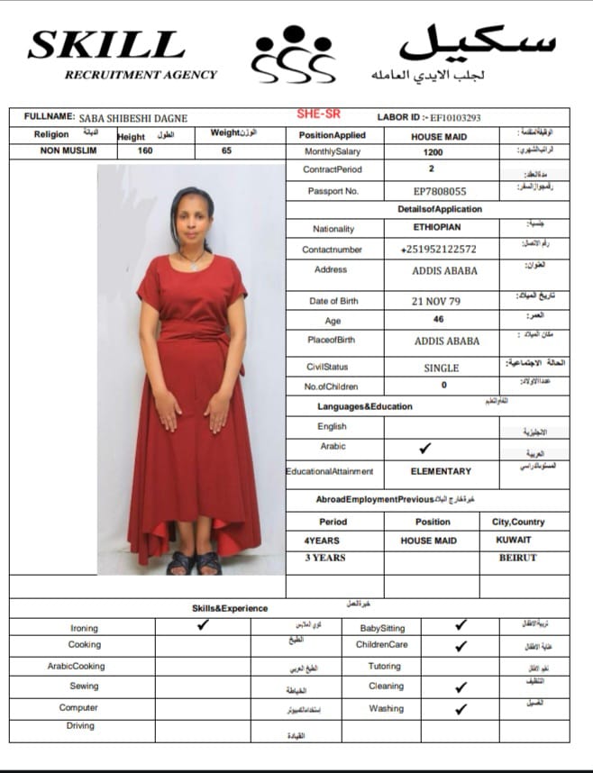 إنها مواطنة سابقة في الخارج في بيروت، وهي تعرف تنظيف المكواة وترتيب المناطق المتسخة في المنزل، كما يمكنها رعاية الطفل وتعلمت طهي الطعام العربي.