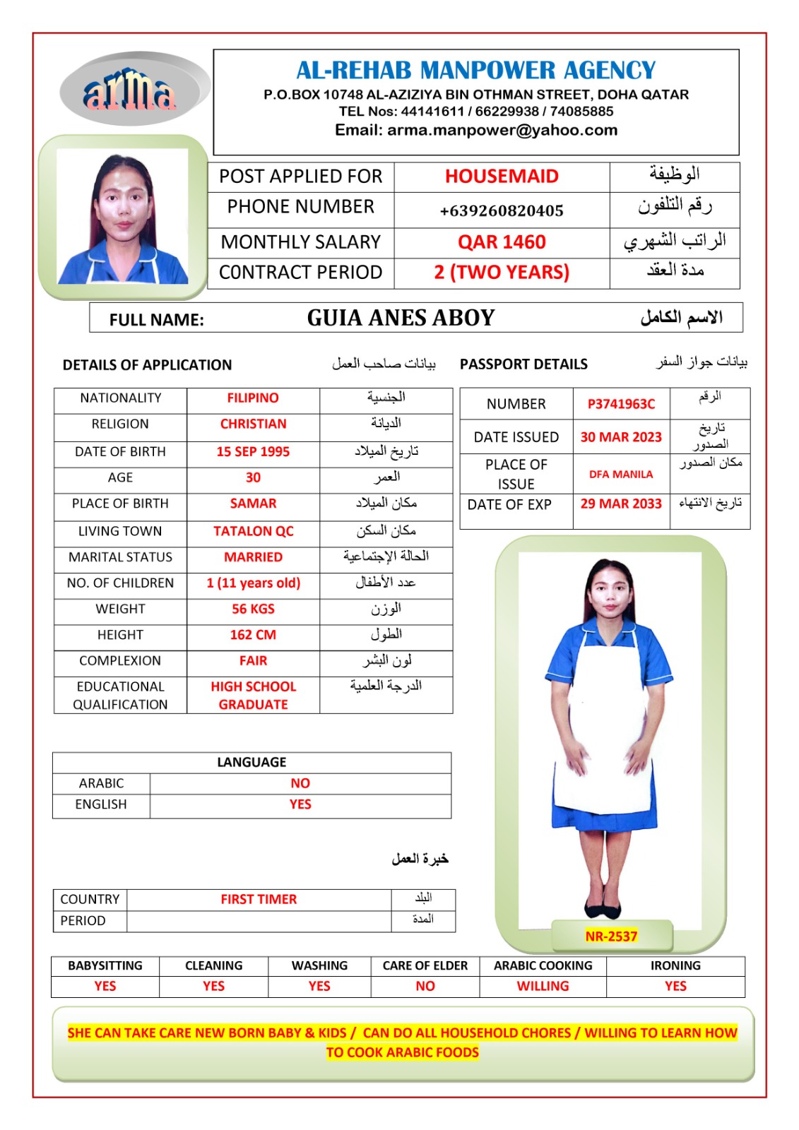 يمكنها رعاية المواليد الجدد والأطفال والقيام بجميع الأعمال المنزلية. مستعدة لتعلم طبخ الأطعمة العربية