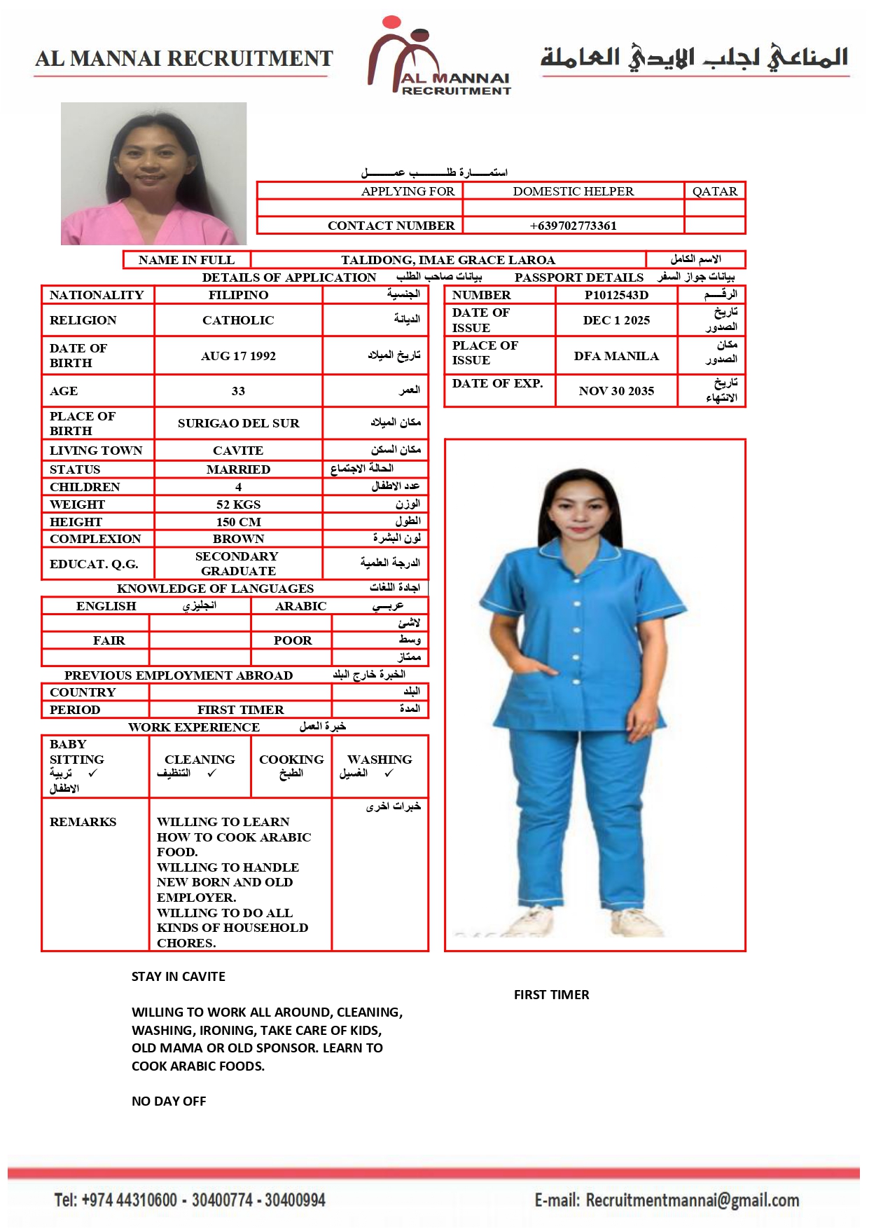 الاسم - عربي IMAE GRACE LAROA TALIDONG