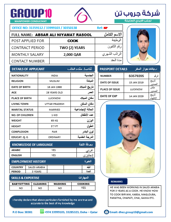 الاسم - عربي ABSAR ALI NIYAMAT RASOOL