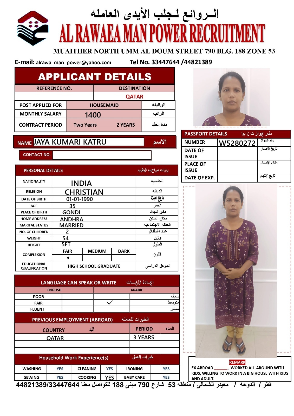 العنوان الدوحه / معيذر الشمالى / شارع ام الدوم منطقه 53 شارع 790 مبنى 188