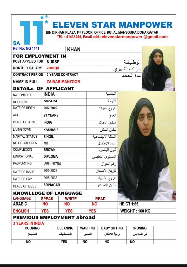 الاسم - عربي ZAINAB MANZOOR/ AVAILABLE GOOD NURSE