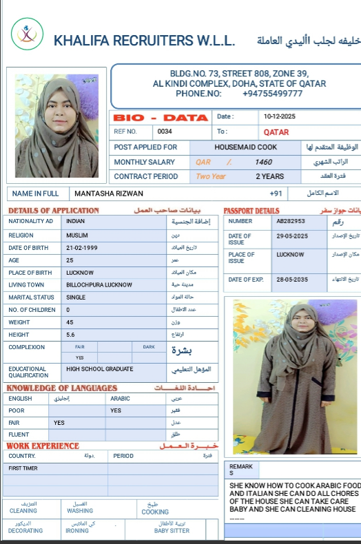 الاسم - عربي MANTASHA RIZWAN