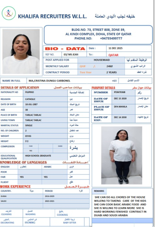 الاسم - عربي Ma. Cristina Dungu Carbonel