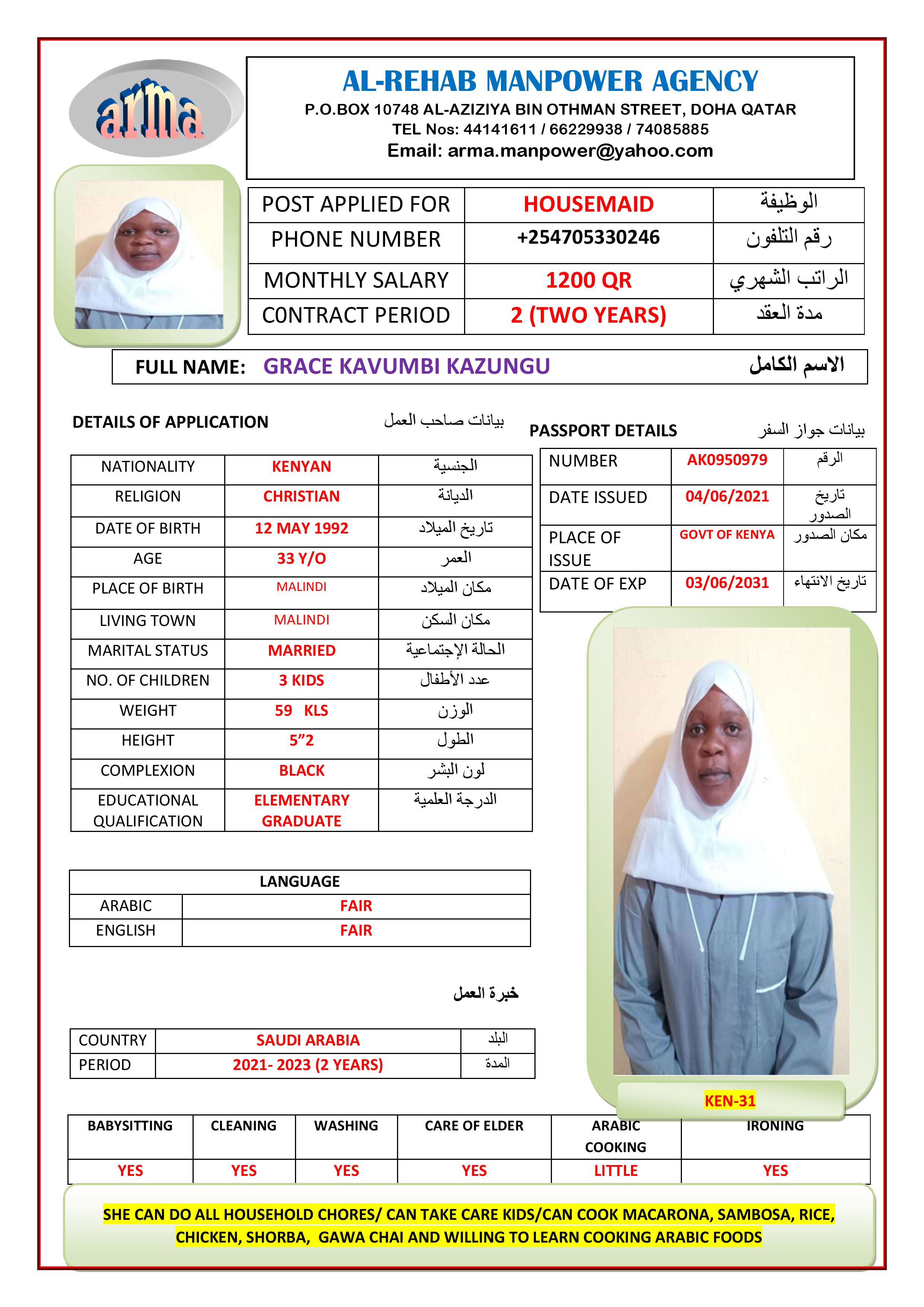 بإمكانها رعاية الأطفال حديثي الولادة والأطفال، والقيام بجميع الأعمال المنزلية. تجيد طهي الطعام العربي مثل المعكرونة والسمبوسة والأرز والدجاج وشراب الشاي، ولديها رغبة في تعلم المزيد.